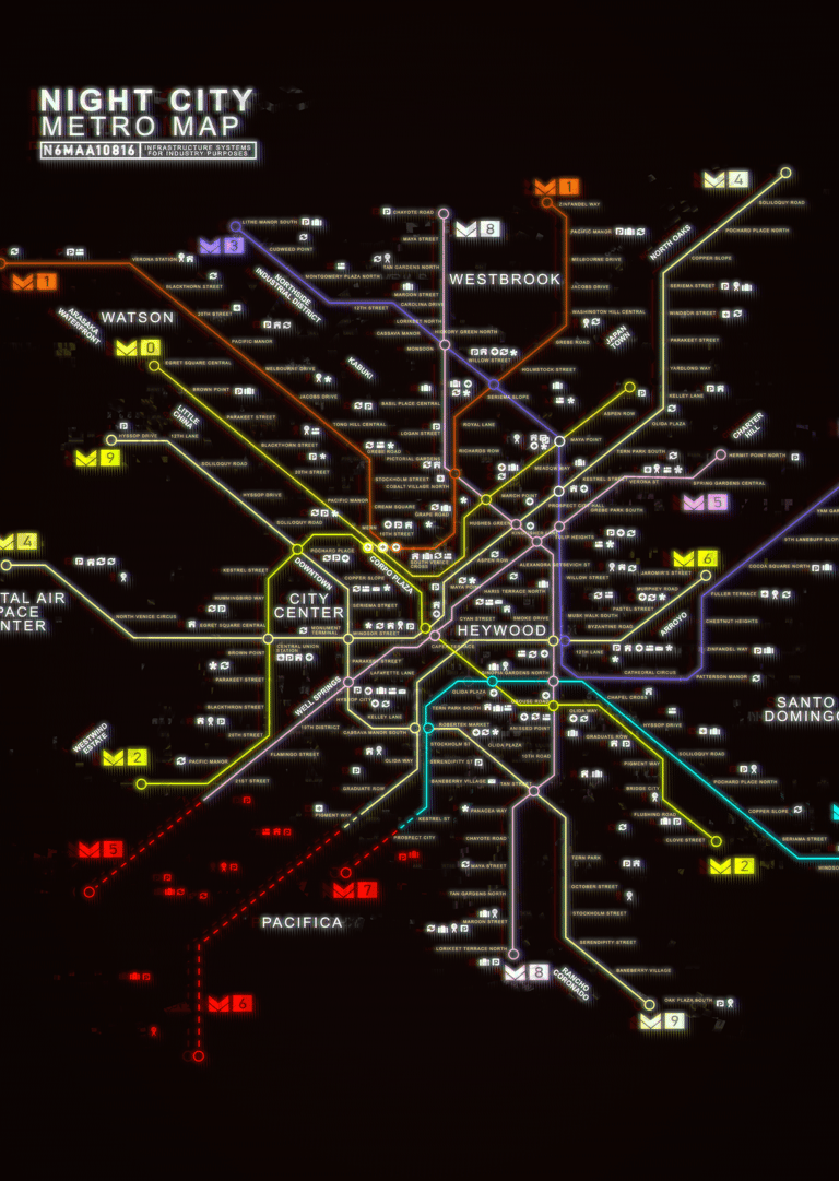 Night City cuenta con una extensa red de metro y tienes un gran plano de las lineas en la sección MAPAS.